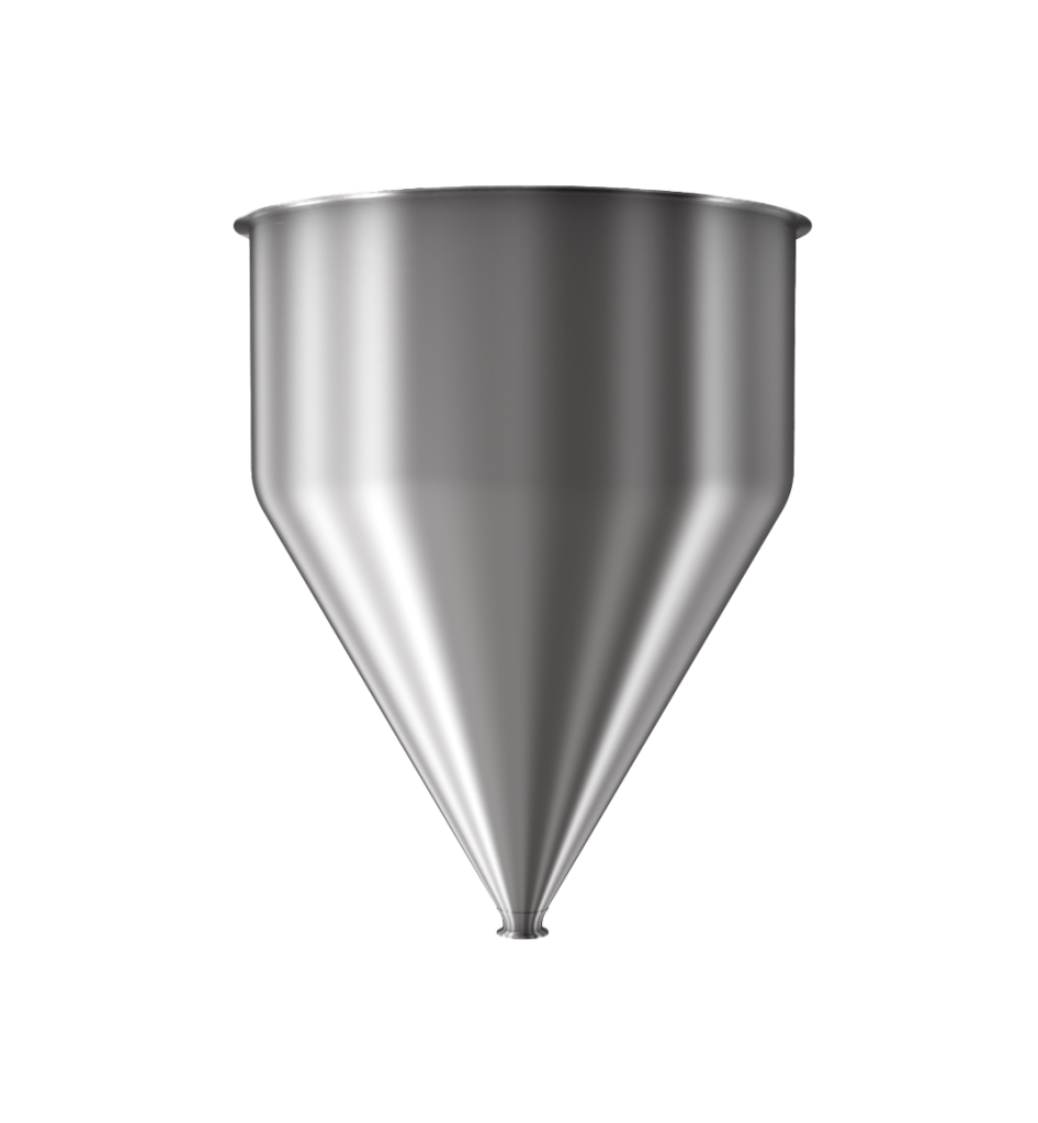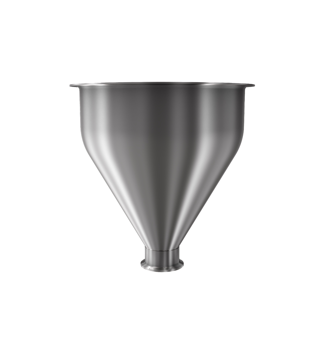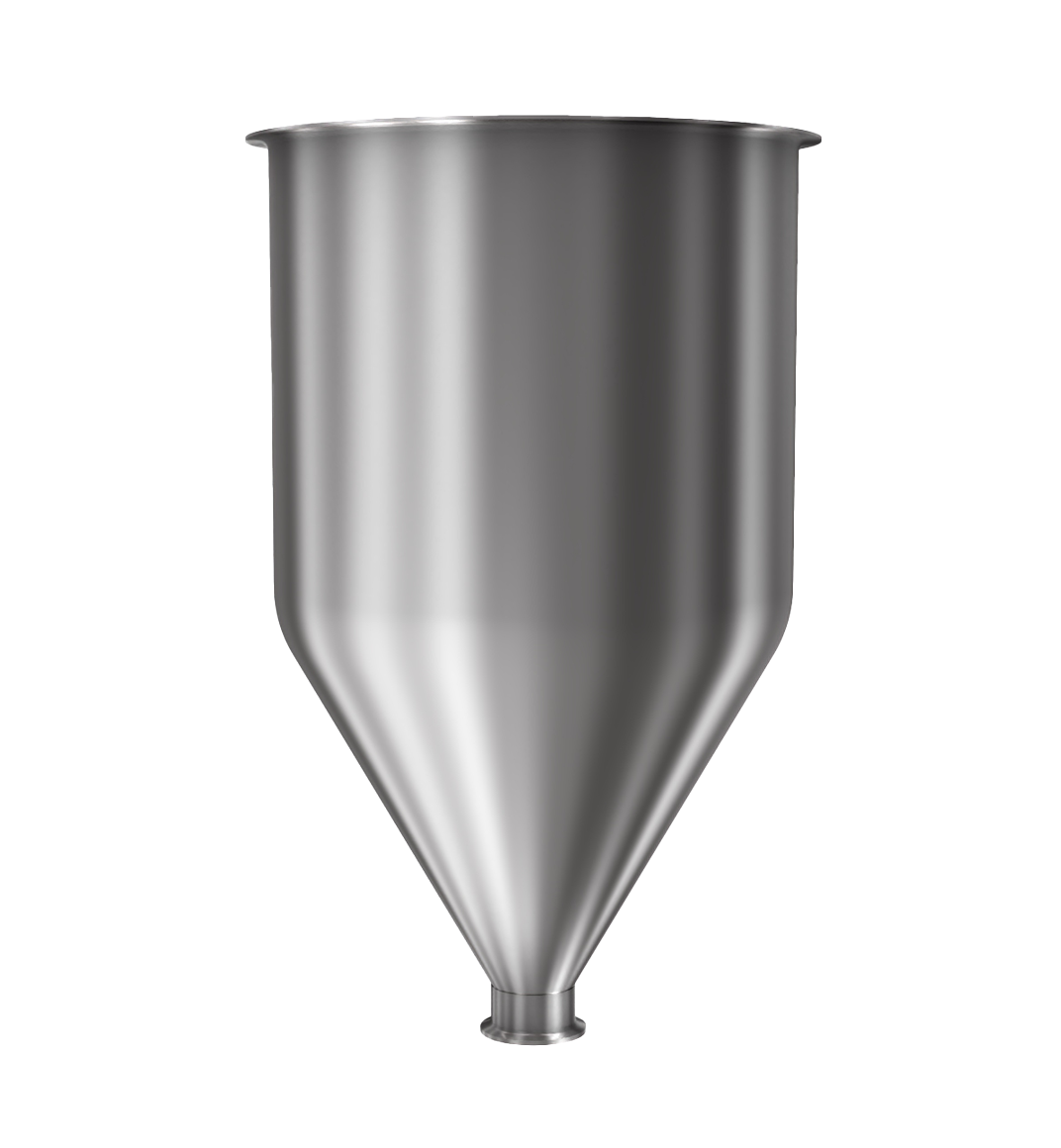 China Metal Spinner ’s sanitary stainless steel funnels are manufactured by welding a stainless steel fitting to the end of our industrial funnels, and finishing it off with a 32ra sanitary finish on the inside, and a 125ra cosmetic finish to the outside. Using TIG welding, common weld related issues such as corrosion, leaking, cracks, sanitary, and porosity issues are eliminated. The smooth weld-free radius transition between the cone shaped bottom and cylinder shaped top improves both product flow and clean out for the applications requiring sanitary conditions. Sanitary funnels are made to order, and can be purchased through our online shop! For an instant quote, we recommend utilizing our Hopper Configurator.