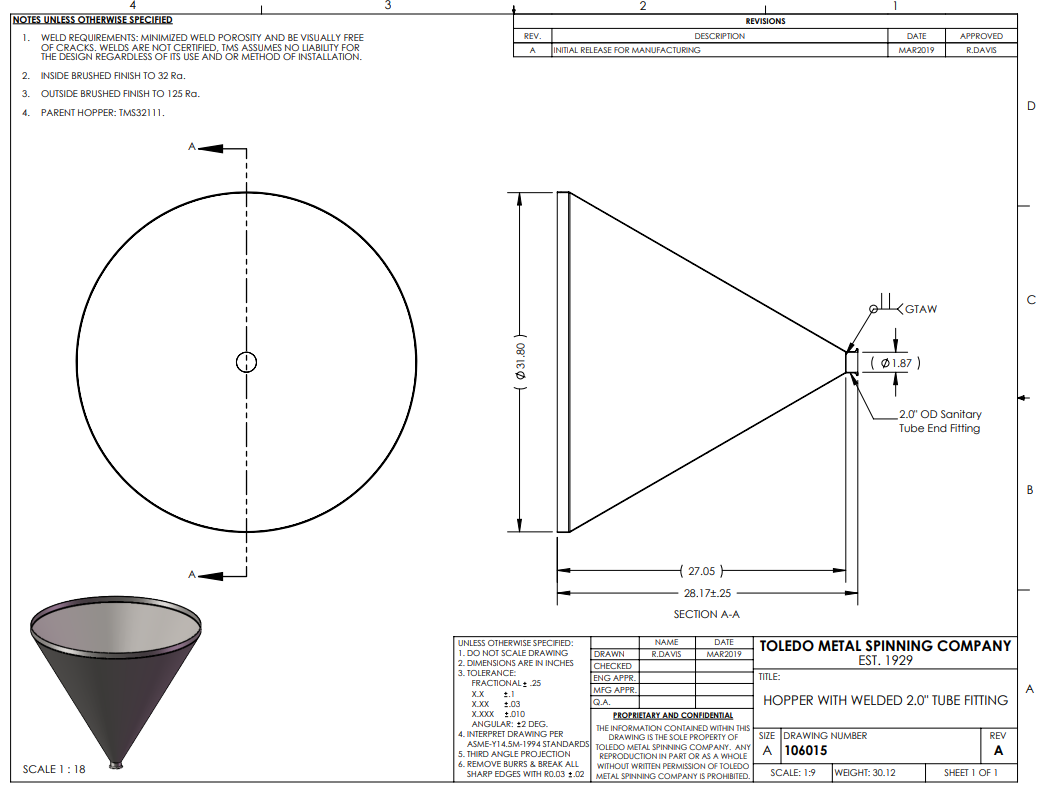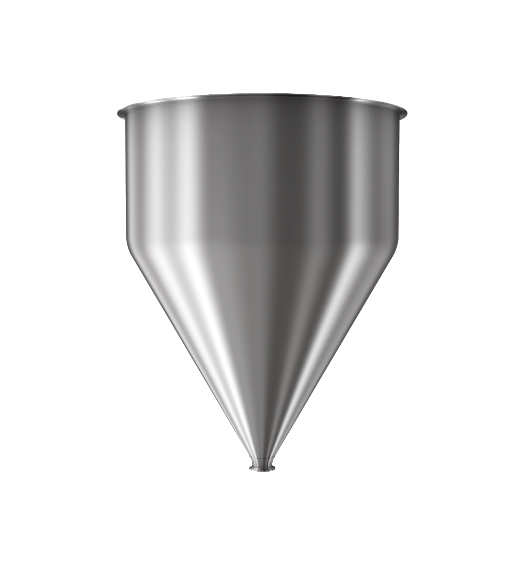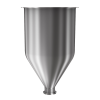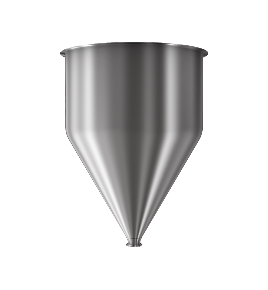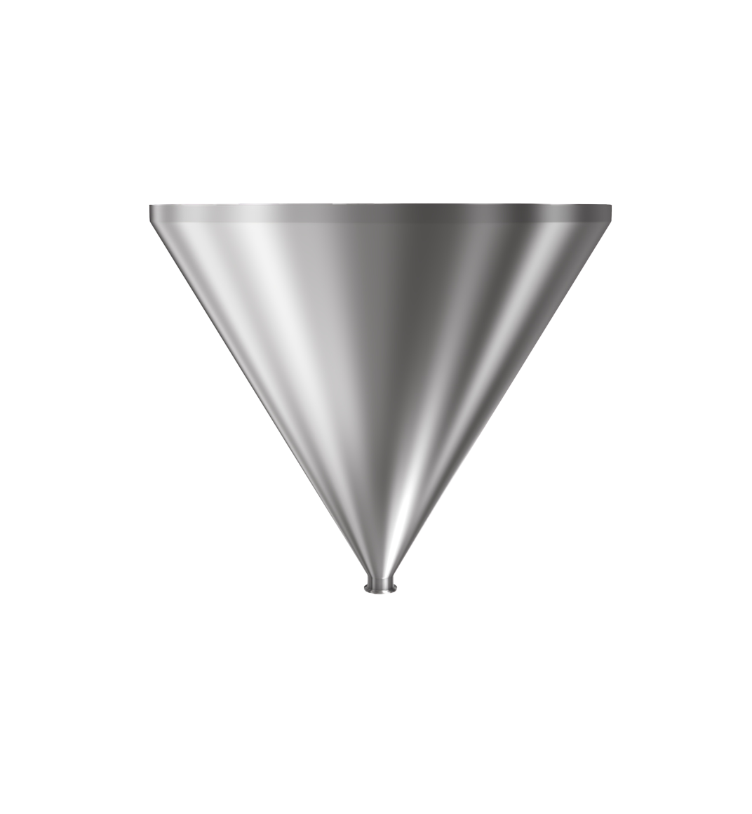 China Metal Spinner ’s sanitary stainless steel funnels are manufactured by welding a stainless steel fitting to the end of our industrial funnels, and finishing it off with a 32ra sanitary finish on the inside, and a 125ra cosmetic finish to the outside. Using TIG welding, common weld related issues such as corrosion, leaking, cracks, sanitary, and porosity issues are eliminated. The smooth weld-free radius transition between the cone shaped bottom and cylinder shaped top improves both product flow and clean out for the applications requiring sanitary conditions. Sanitary funnels are made to order, and can be purchased through our online shop! For an instant quote, we recommend utilizing our Hopper Configurator.