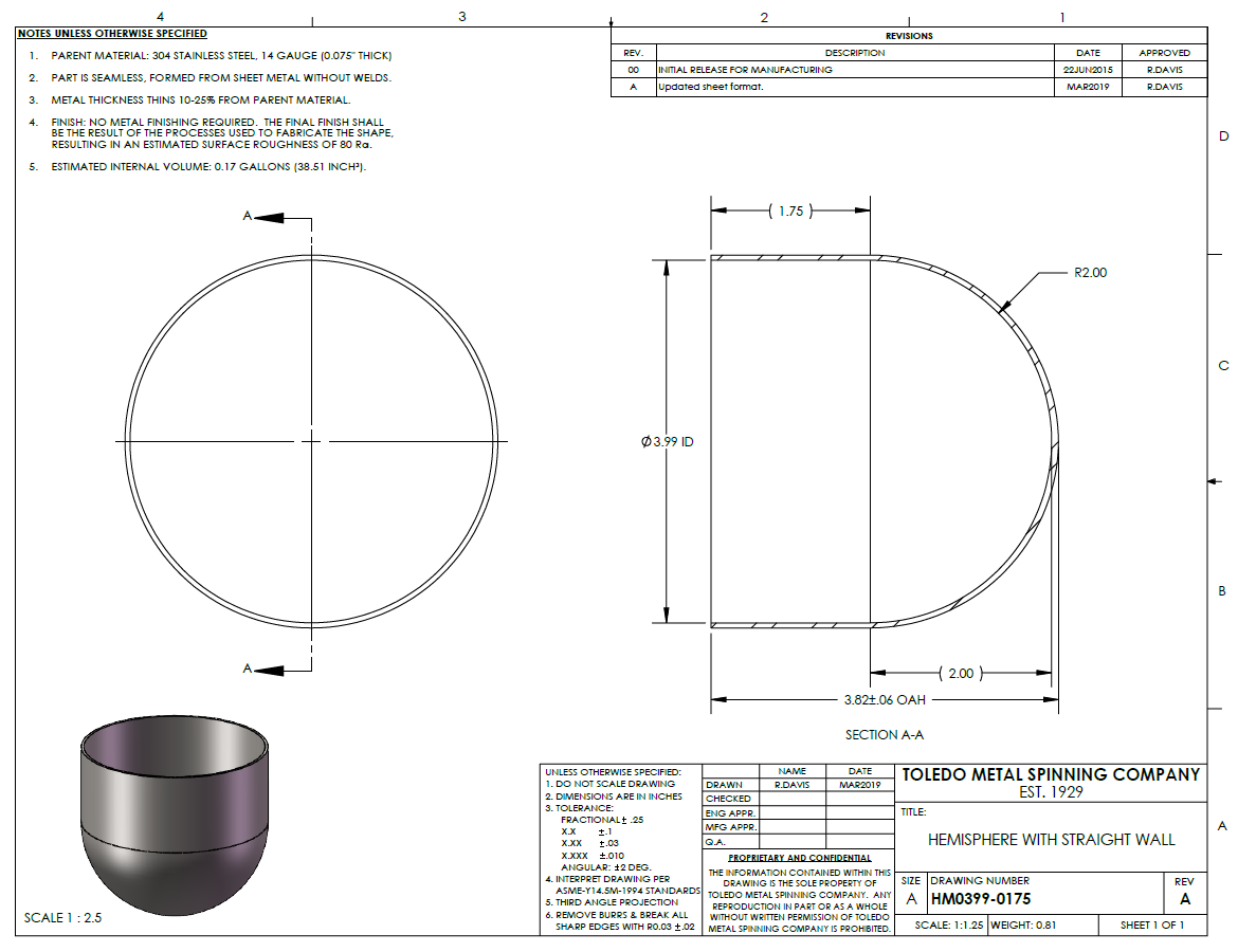 CMS has available standard tooling to form hemispheres from metals such as cold rolled steel, stainless steels including 304 and 316, aluminum, copper, and brass. We have many different diameter tools available, with some tools having a straight wall option. Check out our hemisphere tables in this section along with the various metals and thicknesses that we can form.