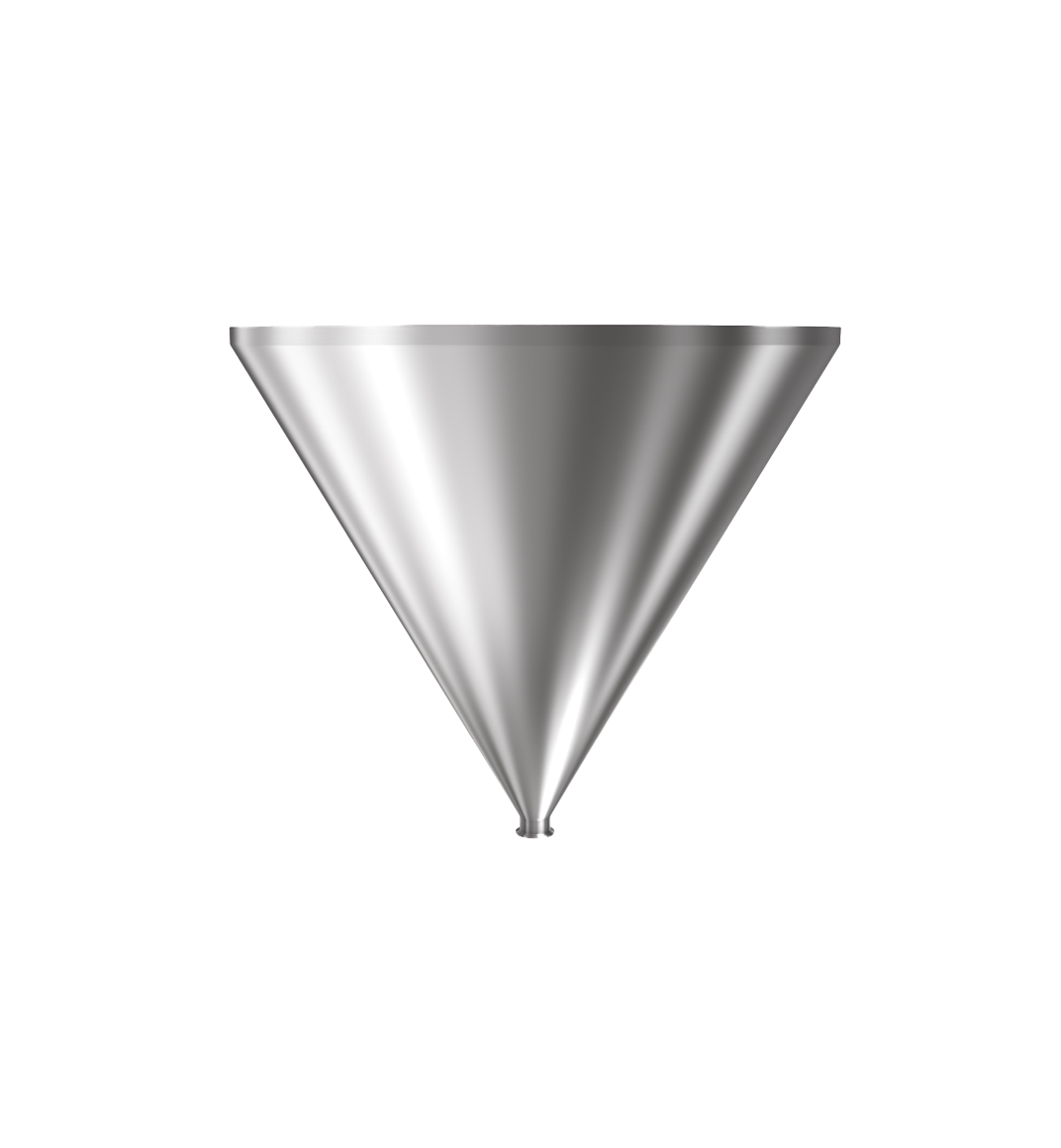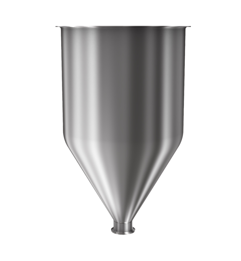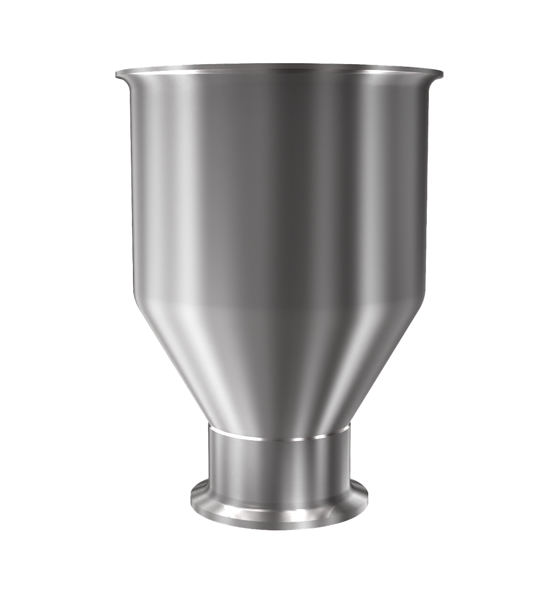China Metal Spinner ’s sanitary stainless steel funnels are manufactured by welding a stainless steel fitting to the end of our industrial funnels, and finishing it off with a 32ra sanitary finish on the inside, and a 125ra cosmetic finish to the outside. Using TIG welding, common weld related issues such as corrosion, leaking, cracks, sanitary, and porosity issues are eliminated. The smooth weld-free radius transition between the cone shaped bottom and cylinder shaped top improves both product flow and clean out for the applications requiring sanitary conditions. Sanitary funnels are made to order, and can be purchased through our online shop! For an instant quote, we recommend utilizing our Hopper Configurator.