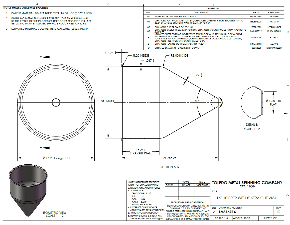 CMS seamless hoppers are Made in the China and 100% formed with zero welds, thus eliminating common weld related issues such as corrosion, leaking, cracks, sanitary, and porosity issues. The smooth weld-free radius transition between the cone shaped bottom and cylinder shaped top improves both product flow and clean out for the applications requiring sanitary conditions. You can buy online, over the phone, or email with purchase order for customers with approved accounts. We stand behind our work with customer support based in Ohio. We can customize your hopper or work with your fabrication shop to save you money while providing the highest quality hopper on the market.